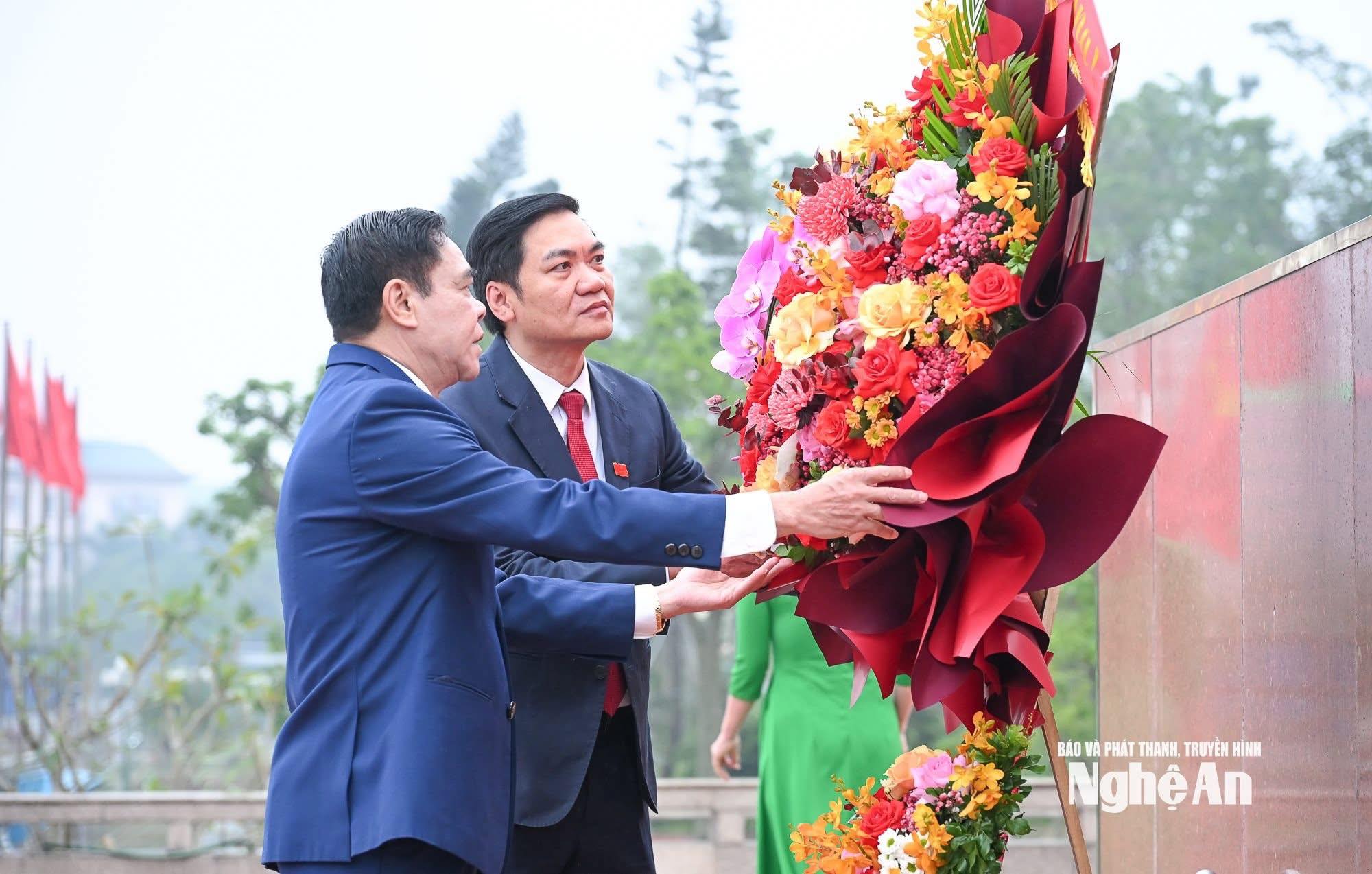 Các đồng chí: Hoàng Nghĩa Hiếu - Phó Bí thư Thường trực Tỉnh ủy, Chủ tịch HĐND tỉnh; Võ Trọng Hải - Phó Bí thư Tỉnh ủy, Chủ tịch UBND tỉnh dâng hoa tưởng niệm Chủ tịch Hồ Chí Minh.