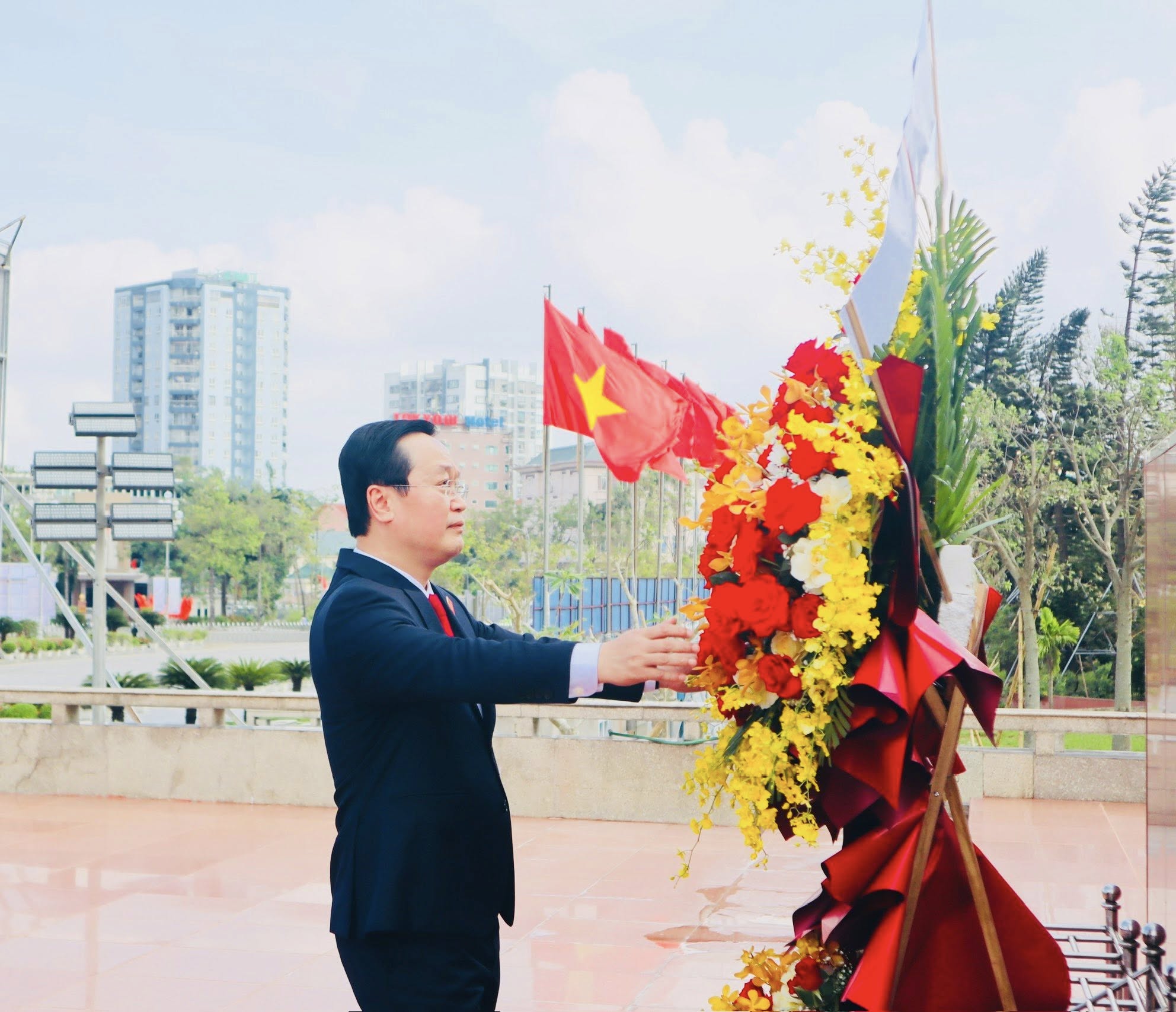Đồng chí Nguyễn Đức Trung - Bí thư Tỉnh ủy báo công trước tượng đài Bác Hồ