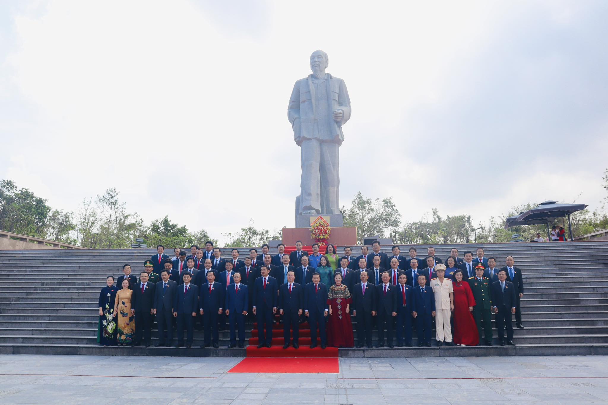 Đoàn đại biểu Ban Chấp hành Đảng bộ tỉnh khóa XIX và trưởng các đoàn đại biểu chụp lưu niệm trước tượng đài Bác Hồ tại Quảng trường Hồ Chí Minh