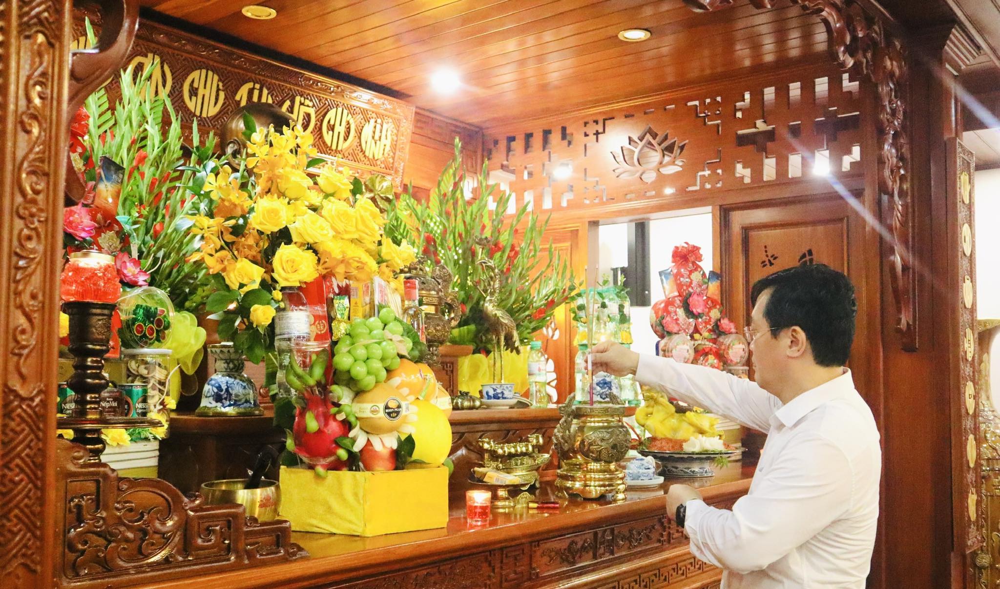 Đồng chí Nguyễn Đức Trung - Bí thư Tỉnh ủy thành kính dâng nén tâm hương, dâng lẵng hoa tươi thắm trước anh linh của Người