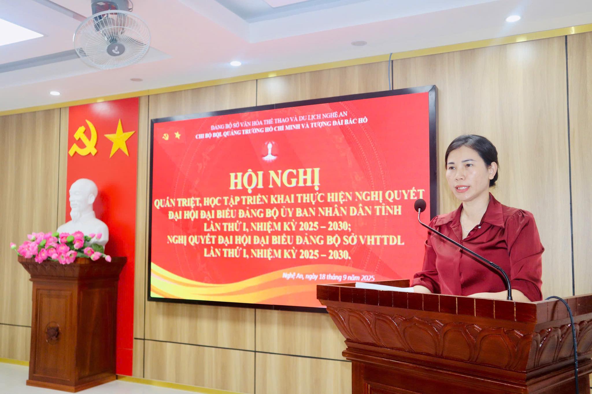 Thực hiện Kế hoạch số 47-KH/ĐU ngày 05/9/2025 của Sở Văn hoá, Thể Thao và Nghệ An; Kế hoạch tuyên truyền, phổ biến, giáo dục pháp luật, Ban Quản lý Quảng trường Hồ Chí Minh đã tổ chức Hội nghị học tập, quán triệt và triển khai Nghị quyết Đại hội đại biểu Đảng bộ Ủy ban nhân dân tỉnh lần thứ I, nhiệm kỳ 2025 – 2030; Nghị quyết Đại hội đại biểu Đảng bộ Sở VHTTDL lần thứ I, nhiệm kỳ 2025 – 2030; đồng thời triển khai ứng dụng công nghệ AI trong công tác quản lý, tuyên truyền và phổ biến pháp luật.