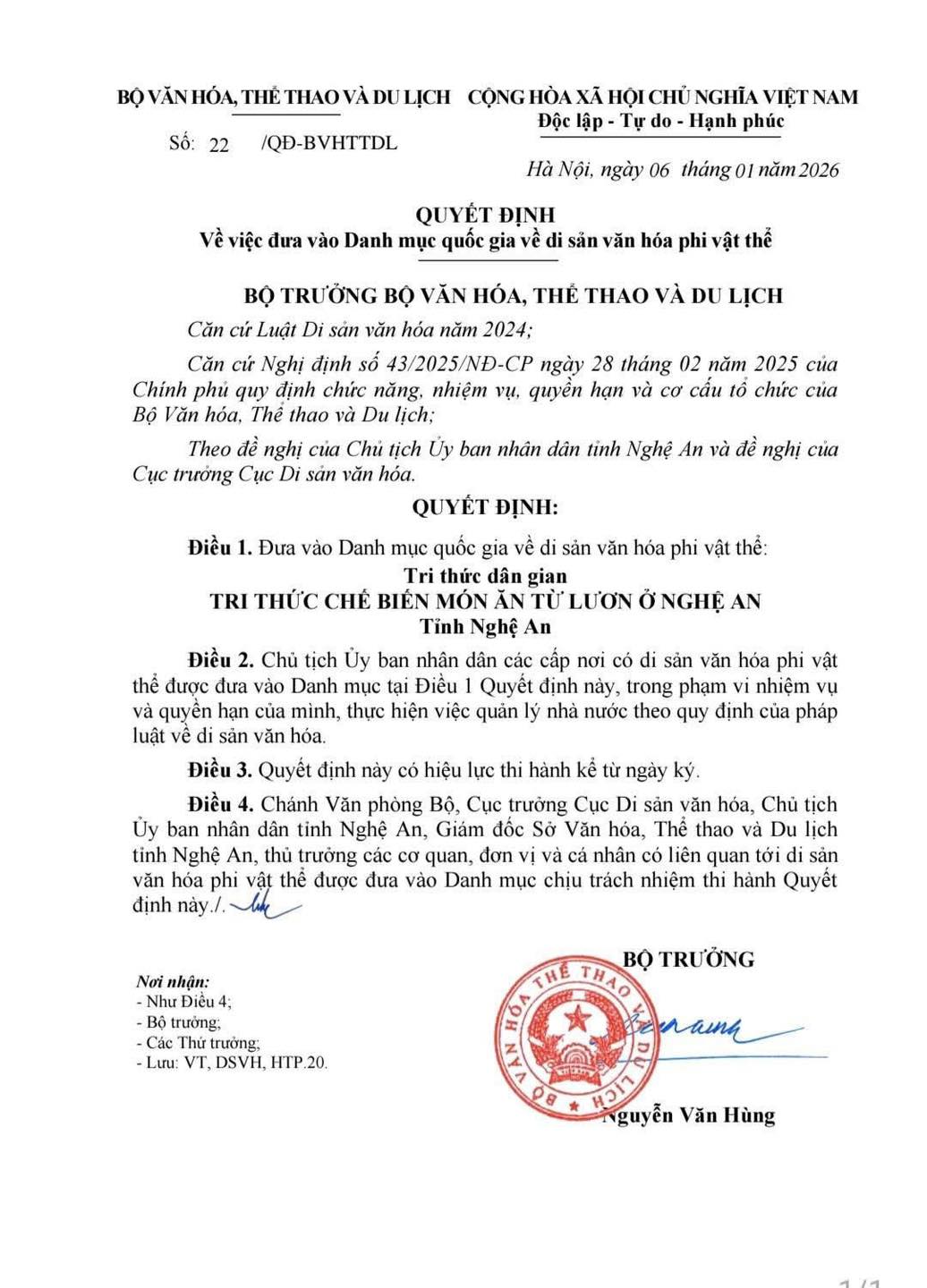Ngày 6/1/2026, Bộ Văn hóa, Thể thao và Du lịch chính thức ghi danh ẩm thực các món ăn từ Lươn vào danh mục Di sản văn hóa phi vật thể quốc gia.