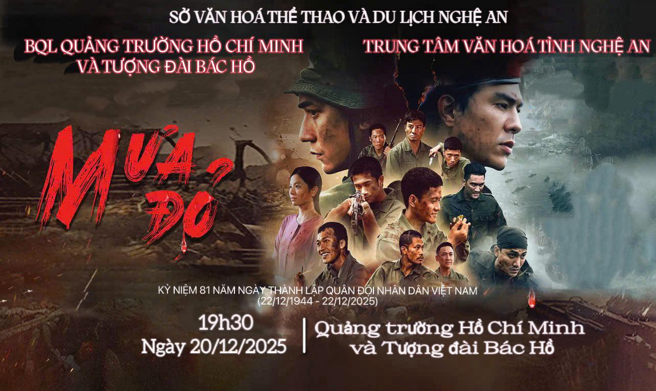 Chào mừng kỷ niệm 81 năm Ngày thành lập QĐND Việt Nam (22/12/1944 – 22/12/2025), Quảng trường Hồ Chí Minh phối hợp Trung tâm Văn hóa tỉnh Nghệ An tổ chức buổi chiếu phim lịch sử bom tấn "MƯA ĐỎ"!