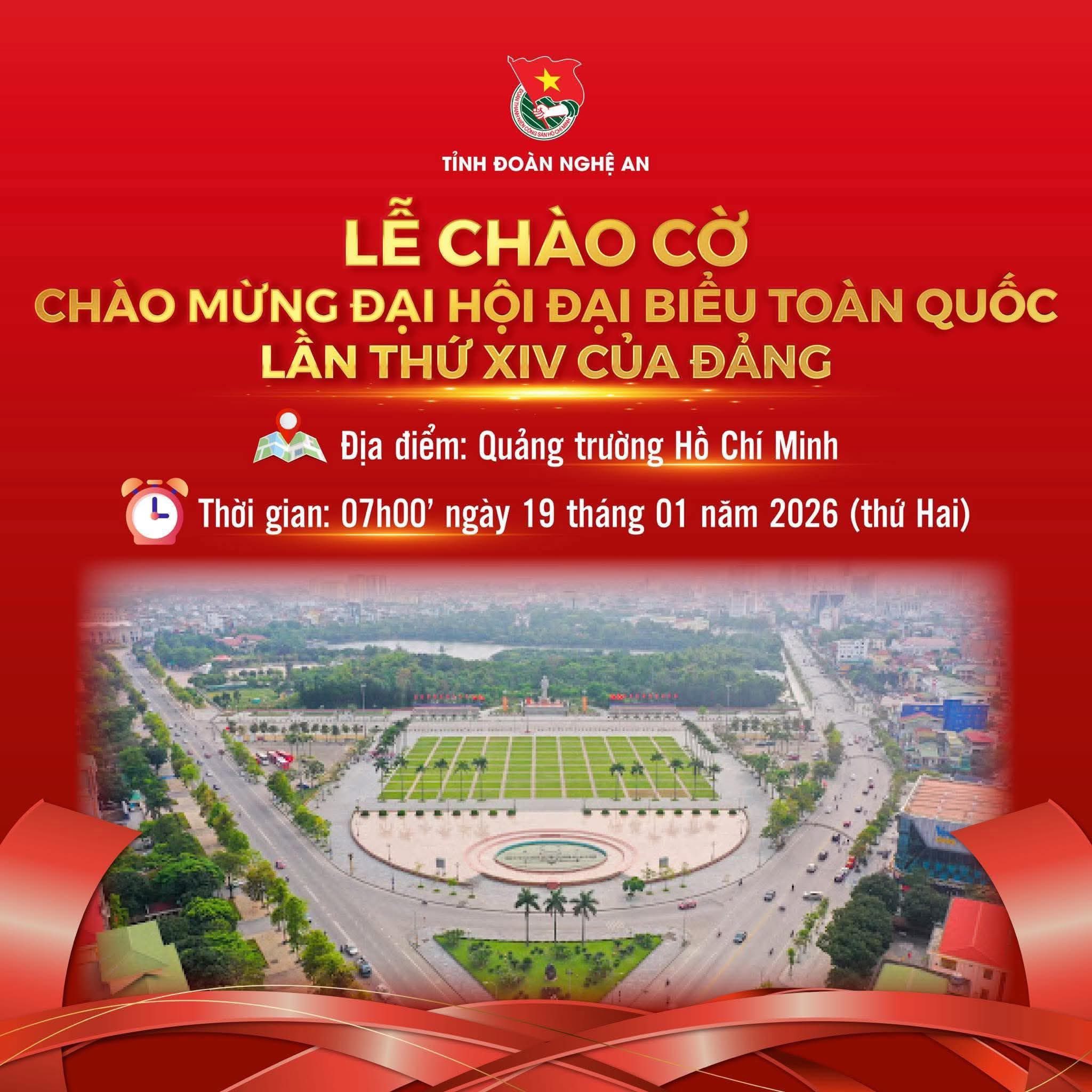 Sáng nay, ngày 19/01/2026, trong không khí cả nước trang trọng hân hoan hướng về Thủ đô Hà Nội khai mạc Đại hội đại biểu toàn quốc lần thứ XIV của Đảng, tại Quảng trường Hồ Chí Minh, Ban Thường vụ Tỉnh đoàn Nghệ An đã trang nghiêm tổ chức Lễ chào cờ chào mừng Đại hội.